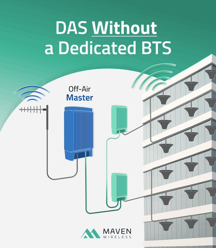 Cirrus captures the outdoor donor signal through an antenna, and feeds it into your digital Maven DAS. The DAS then distributes coverage across the building. No base station, low power use, and a fully digital chain that’s simple to install and easy to maintain.