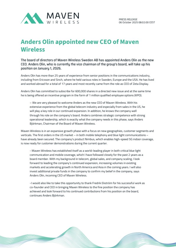 – We are very pleased to welcome Anders as the new CEO of Maven Wireless. With his extensive experience from the global telecom industry and especially from sales in the US, he will play a key role in our continued expansion. In addition, he knows the company well through his role on the company’s board. Anders combines strategic competence with strong operational leadership, which is exactly what the company needs in this phase, says Anders Björkman, Chairman of the Board of Maven Wireless.