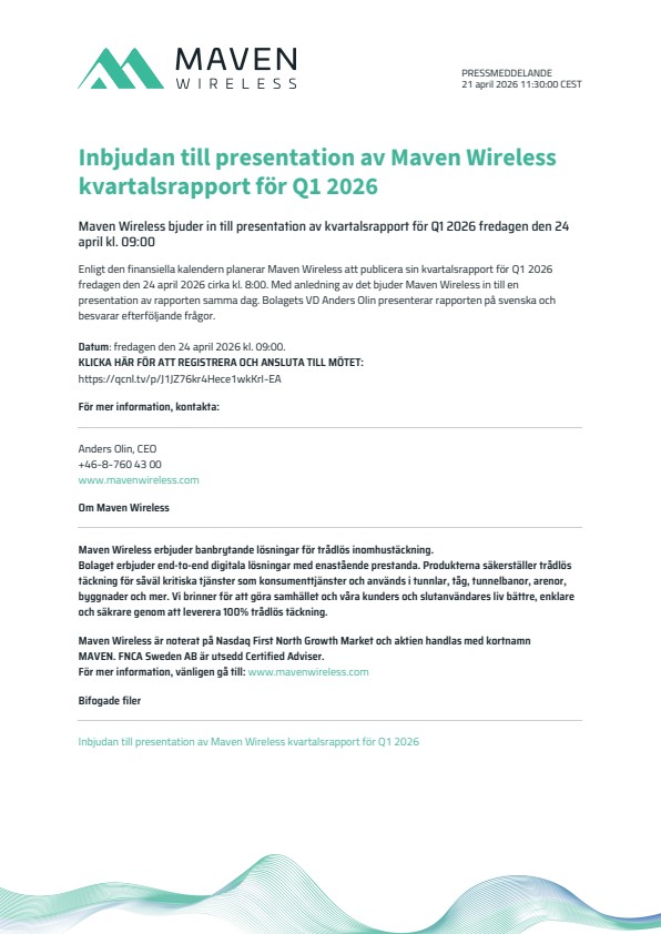 Maven Wireless bjuder in till presentation av kvartalsrapport för Q1 2026 fredagen den 24 april kl. 09:00