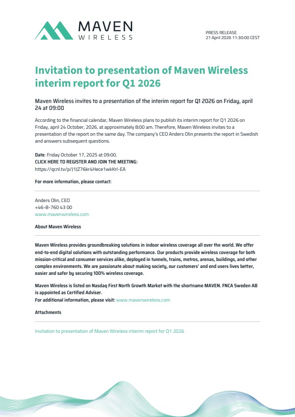 According to the financial calendar, Maven Wireless plans to publish its interim report for Q1 2026 on Friday, april 24 October, 2026, at approximately 8:00 am. Therefore, Maven Wireless invites to a presentation of the report on the same day. The company’s CEO Anders Olin presents the report in Swedish and answers subsequent questions.