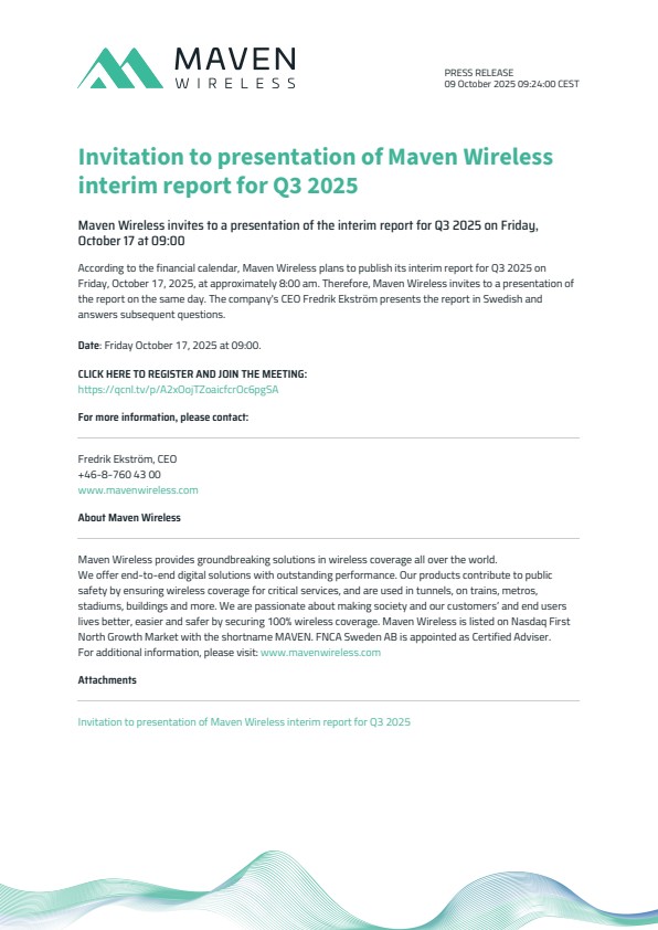 According to the financial calendar, Maven Wireless plans to publish its interim report for Q3 2025 on Friday, October 17, 2025, at approximately 8:00 am. Therefore, Maven Wireless invites to a presentation of the report on the same day. The company’s CEO Fredrik Ekström presents the report in Swedish and answers subsequent questions.