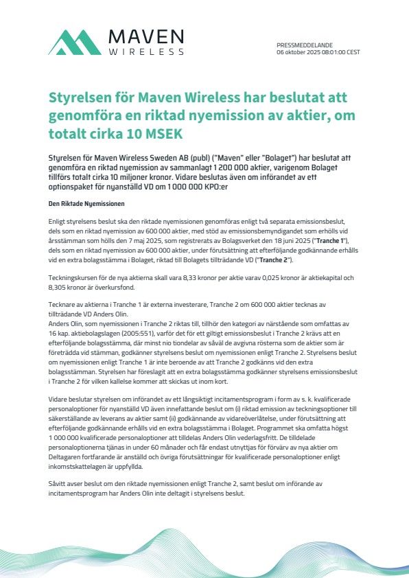 Styrelsen för Maven Wireless har beslutat att genomföra en riktad nyemission av aktier, om totalt cirka 10 MSEK