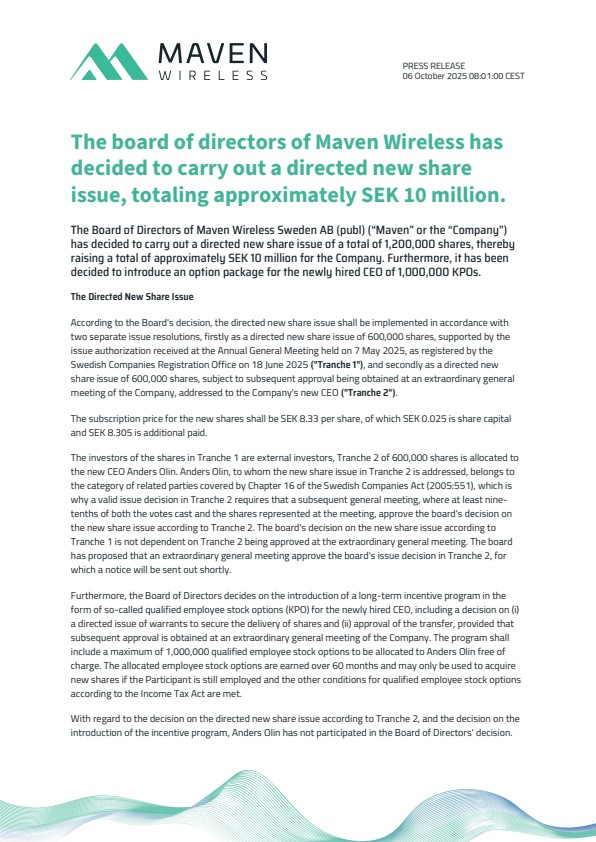 The Board of Directors of Maven Wireless Sweden AB (publ) (“Maven” or the “Company”) has decided to carry out a directed new share issue of a total of 1,200,000 shares, thereby raising a total of approximately SEK 10 million for the Company. Furthermore, it has been decided to introduce an option package for the newly hired CEO of 1,000,000 KPOs.